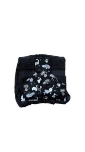 The top is black with lots of cartoon like cats tossed about. Not that I would ever toss a cat!